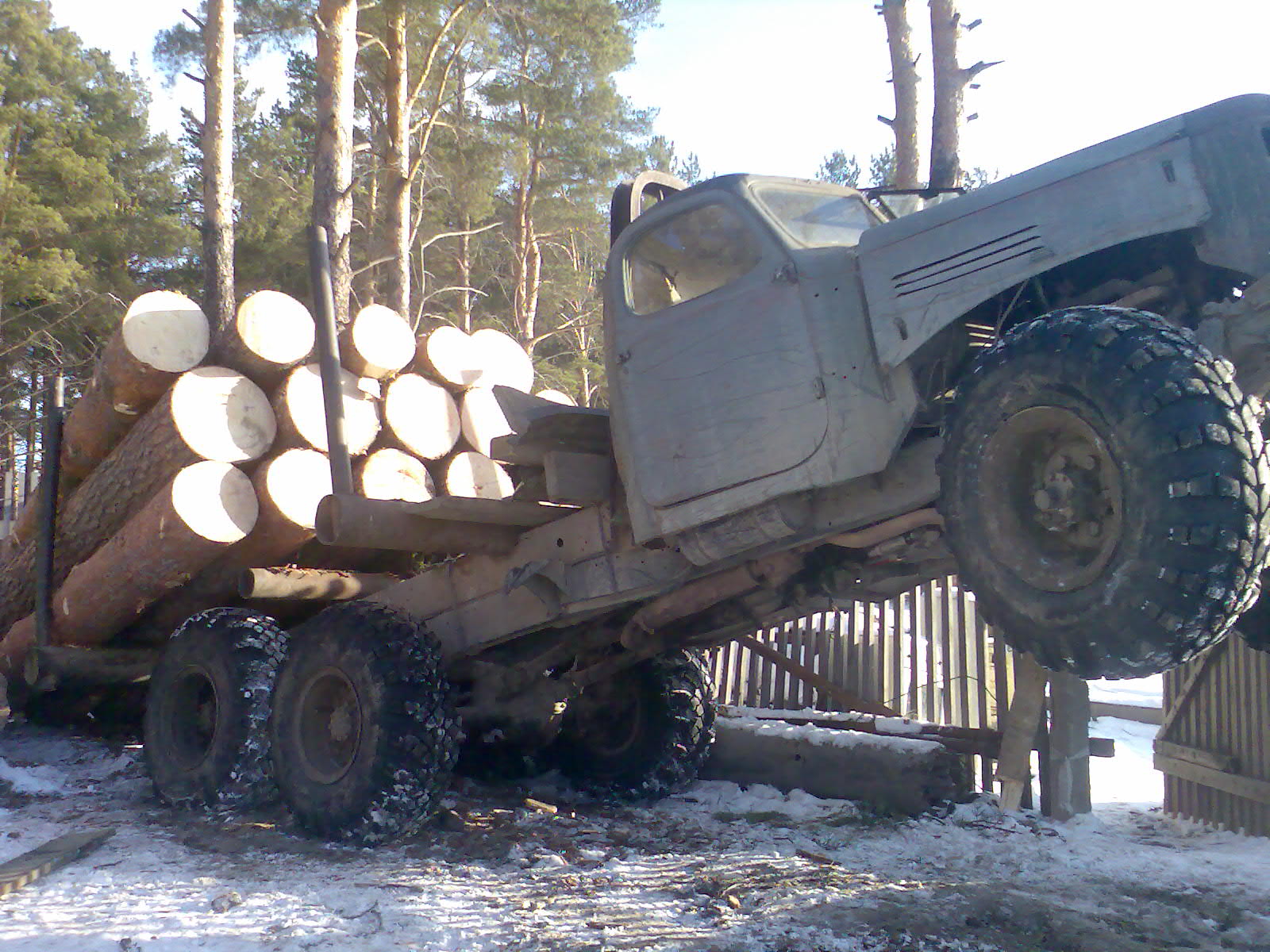 Это промежуточный вариант. Колесная формула 8 х 8. Все колеса - арочные - передние - модель Я - 187 размер 1140 х 600 мм - на родных дисках для этой резины - ширина диска 600 мм, зад - резина - модель Я - 170 размер 1140 х 700, но посажена на диски от резины Я - 187 - то есть на диск шириной 600 мм, вместо родного диска шириной 700 мм. Управляемость по лесу - шикарная - проходимость - где пешком не пройти.